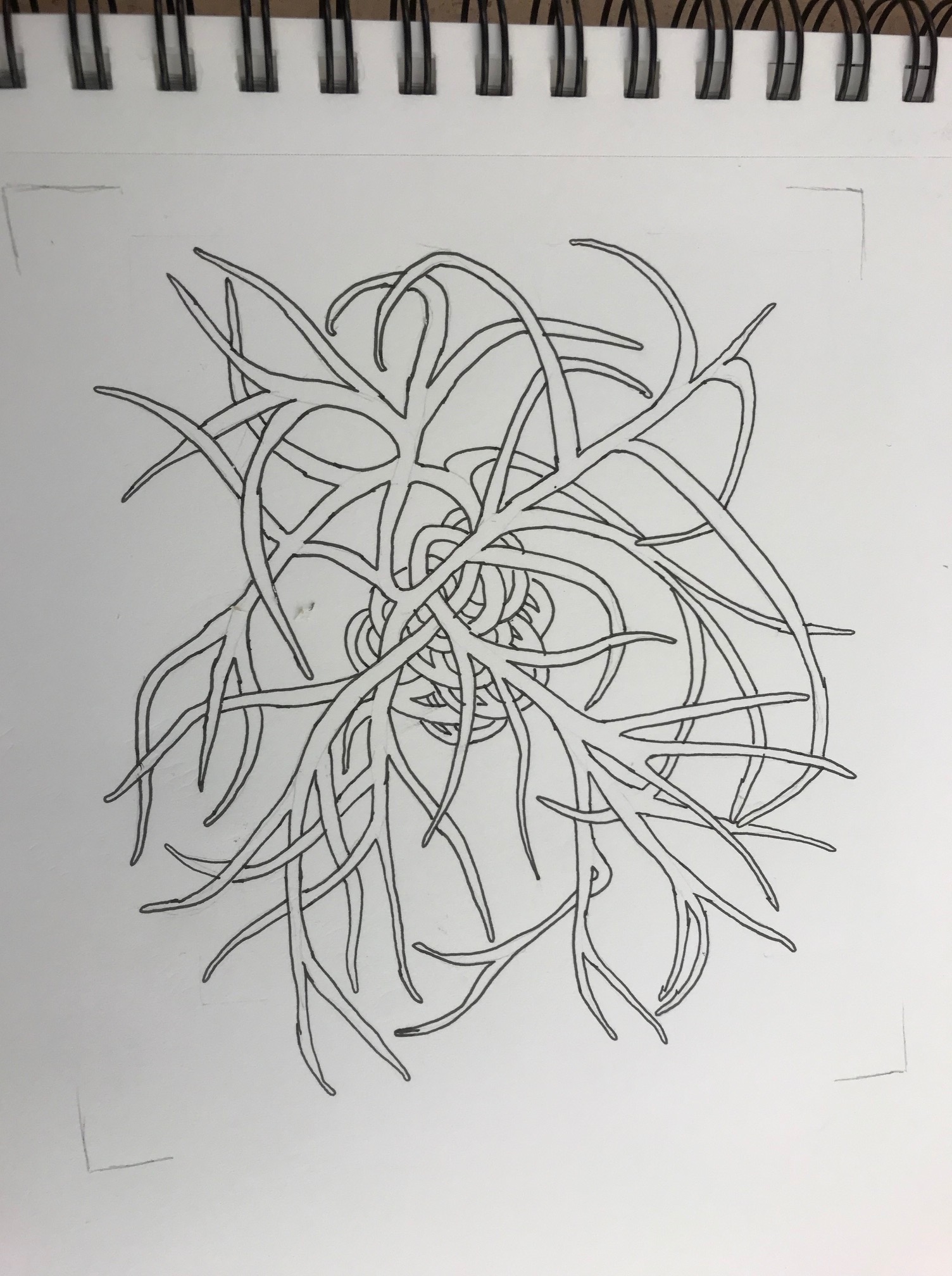 To draw the pine cone, I used a H4 pencil to draw the online then used that as guide line to draw the Pheripheral spikes. I then filled in the depths of the cone by coloring it with a black pen and left the spikes that came towards me uncolored to give it better depth perception